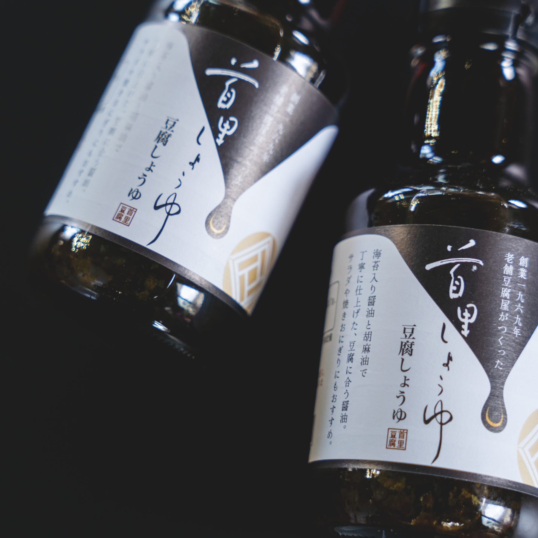 創業当時から作り続けている「首里とうふ」と、口の中で溶けるようななめらかさが特徴の「なめらかゆし豆腐」、有明産海苔入りしょう油とごま油が香る「首里しょうゆ」のギフトセット。